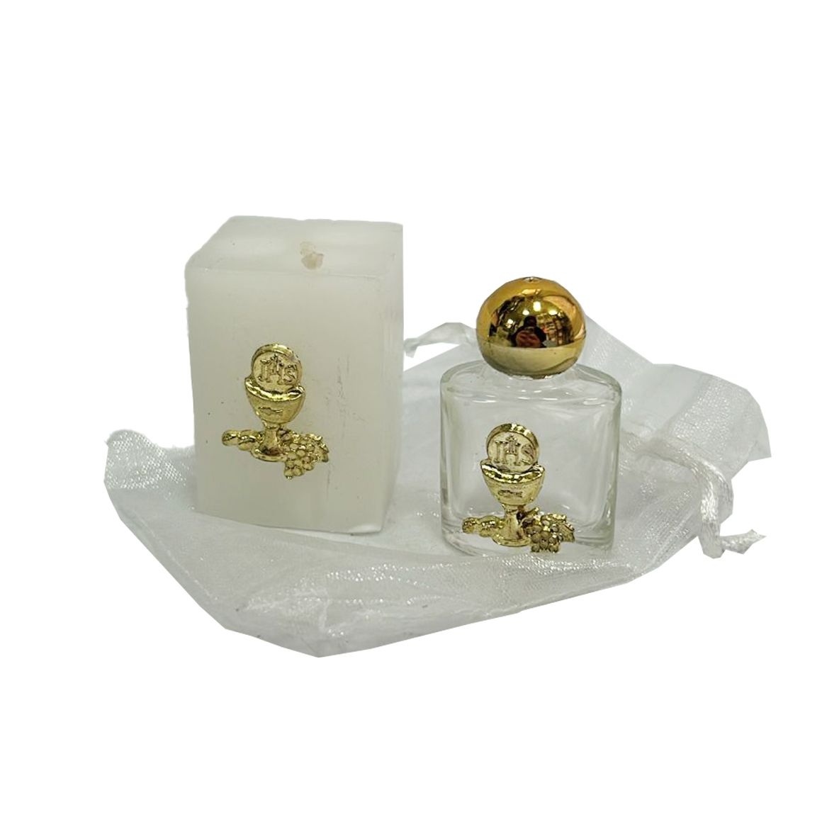 Kit Primeira Eucaristia c/ Vela e Garrafa de Água Benta - 10ml.