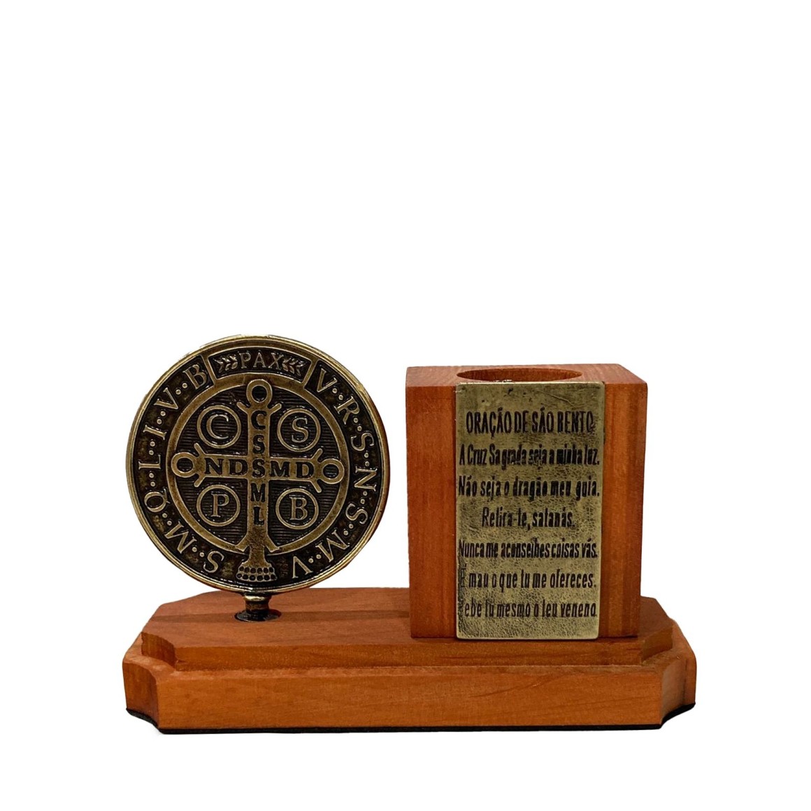 PT2010500 - Porta Canetas São Bento c/ Medalha e Oração Madeira - 8x14cm