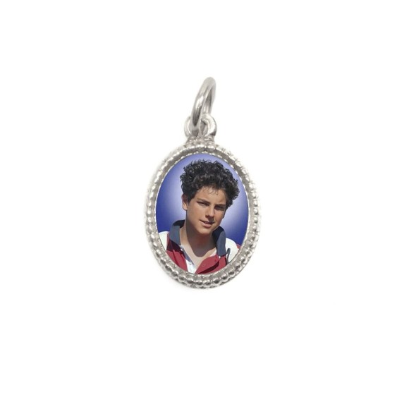 MD102527P20 - Medalha de Alumínio Oval Pequena Prata c/ 20un. São Carlo Acutis- 1,5x1cm