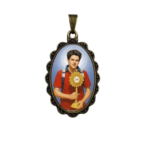 MD128622 - Medalha São Carlo Acutis Rendada Ouro Velho - 4,2x2,5cm
