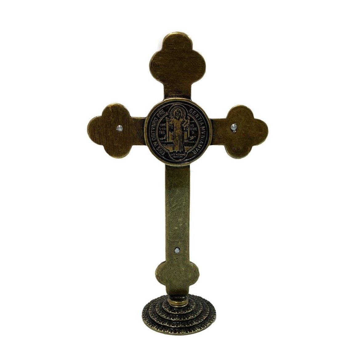 *Crucifixo de Mesa Metal Ouro Velho São Bento - 22,5x14cm.